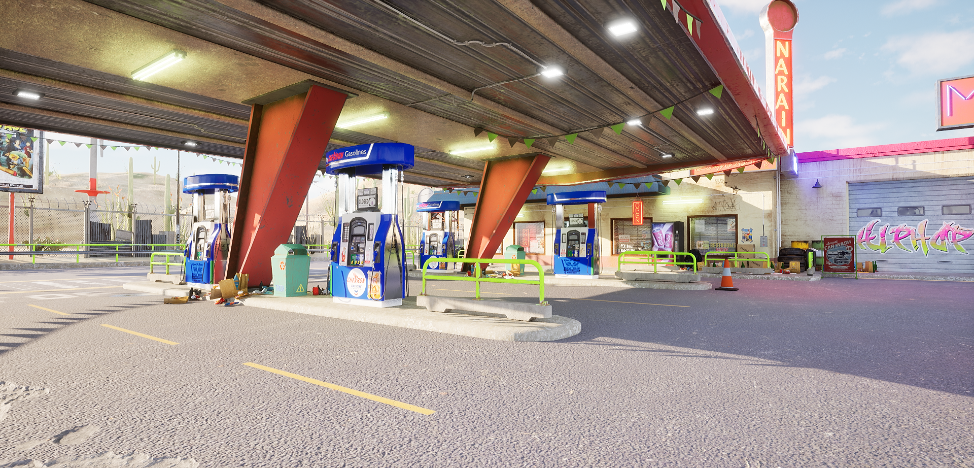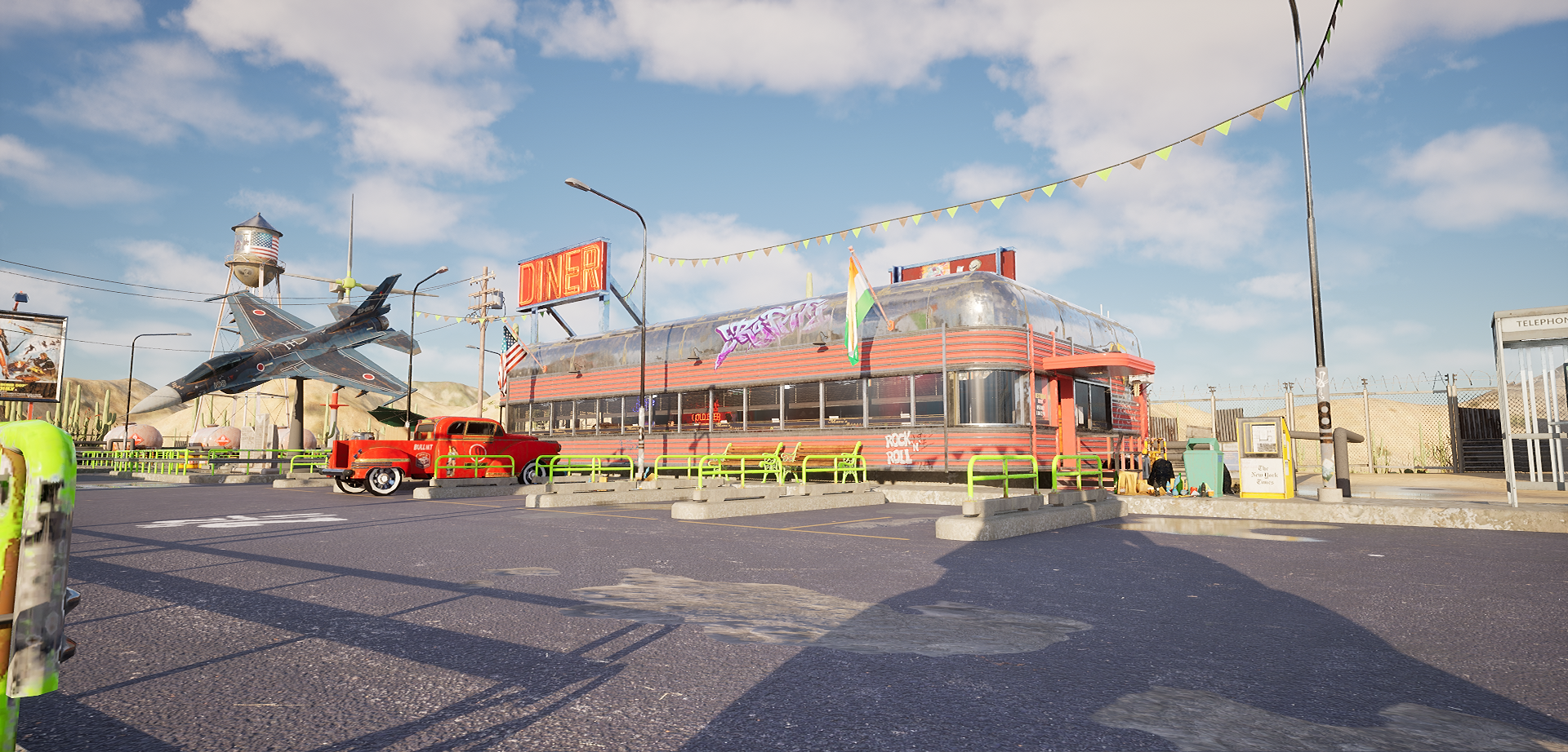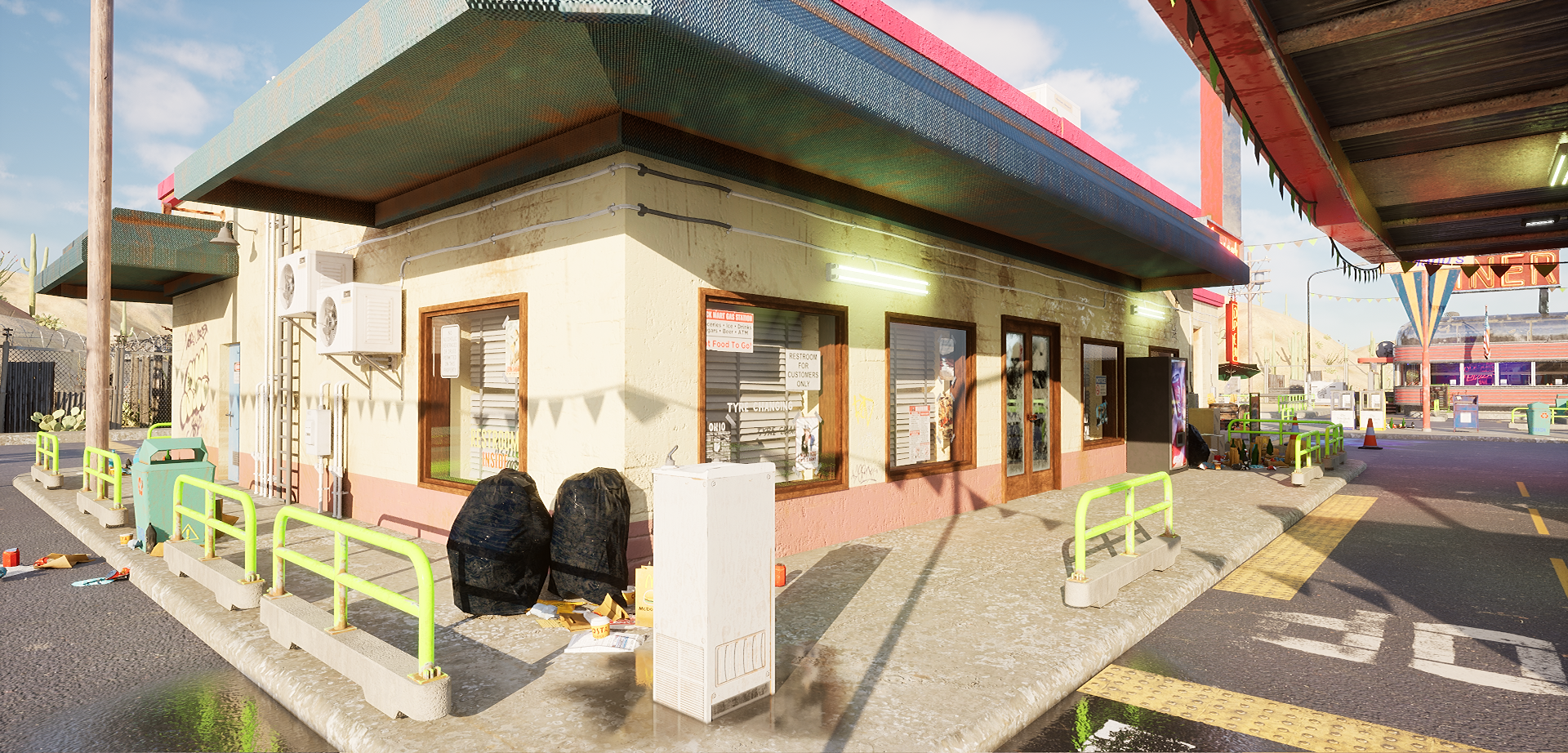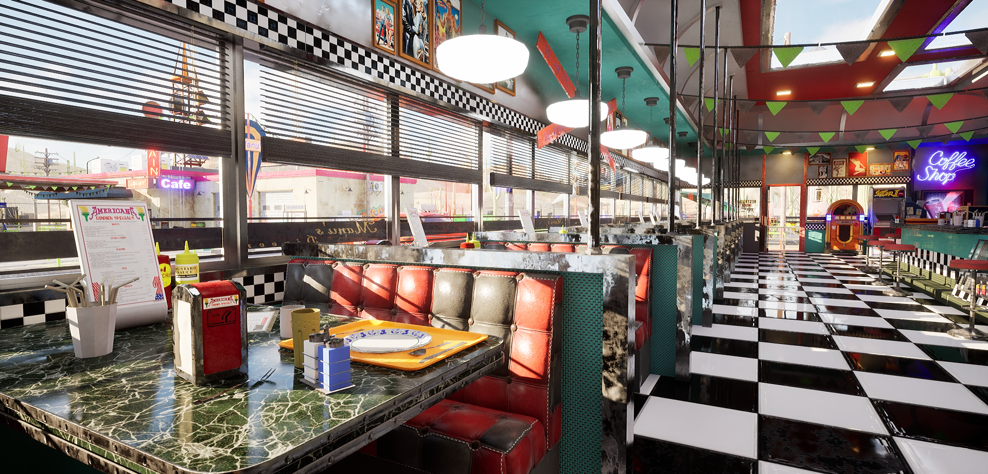 This project presents a detailed recreation of an American diner and fuel station, inspired by classic roadside stops commonly found across the United States. The environment captures the nostalgic charm and functional design typical of these locations. The majority of the assets featured in the scene are meticulously crafted from scratch, ensuring originality and attention to detail. The modeling process was carried out using Maya, where each element was carefully shaped to achieve realistic proportions and structure. Texturing was done in Substance Painter, allowing for precise material application and weathering effects to enhance authenticity. Finally, the entire scene was assembled and rendered in Unreal Engine 5, leveraging its advanced lighting and visual capabilities to create an immersive and lifelike environment.