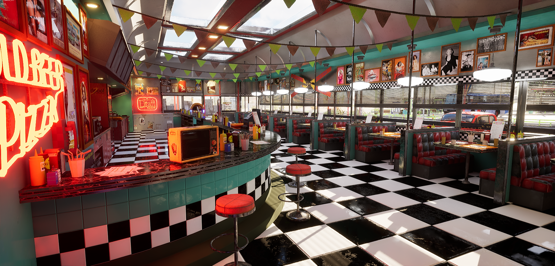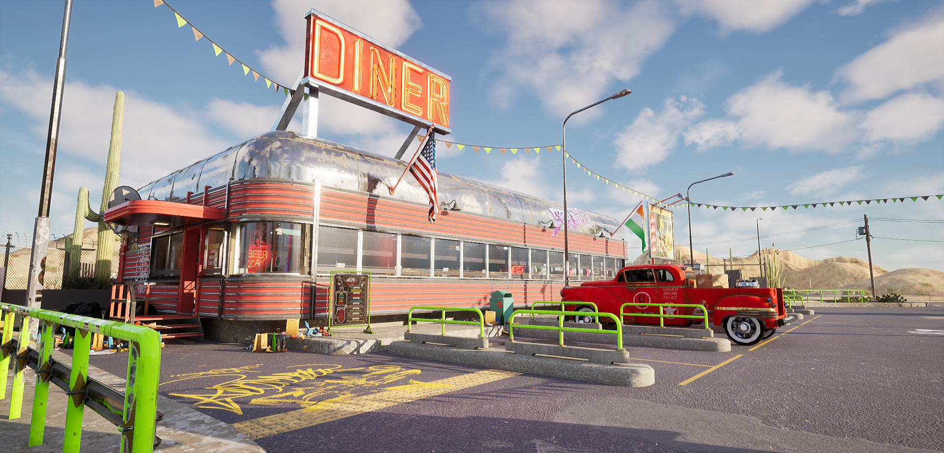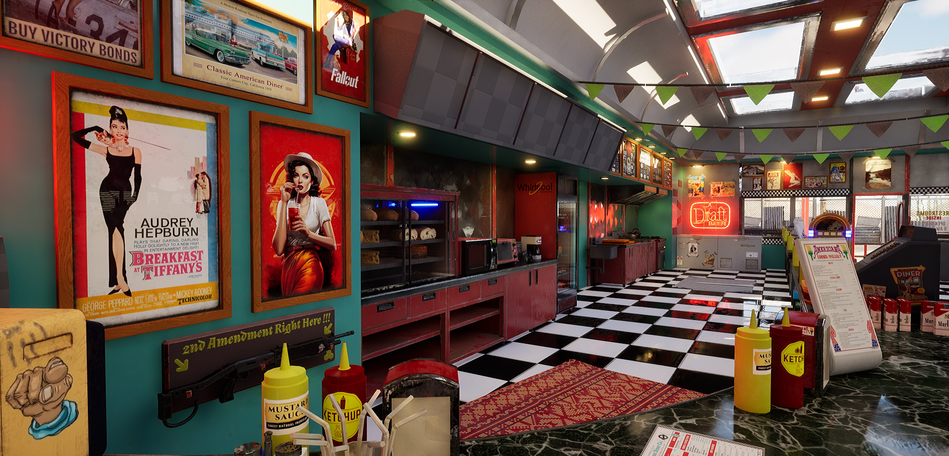 This project presents a detailed recreation of an American diner and fuel station, inspired by classic roadside stops commonly found across the United States. The environment captures the nostalgic charm and functional design typical of these locations. The majority of the assets featured in the scene are meticulously crafted from scratch, ensuring originality and attention to detail. The modeling process was carried out using Maya, where each element was carefully shaped to achieve realistic proportions and structure. Texturing was done in Substance Painter, allowing for precise material application and weathering effects to enhance authenticity. Finally, the entire scene was assembled and rendered in Unreal Engine 5, leveraging its advanced lighting and visual capabilities to create an immersive and lifelike environment.